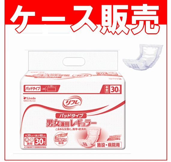 【ケース販売】 【特徴】 ○どんなおむつにもすっぽり収まり、こまめな交換に簡単・経済的 ○ズレ止めテープ付 ○消臭ポリマー配合 臭いにも安心 肌触りの良いソフトな不織布 ○パッド表面に弱酸性素材採用 商品名 リフレ パッドタイプ「男女兼用レギュラー」 (病院・施設用) タイプ パッドタイプ 吸水量 総吸収量400cc/目安吸収量240cc (おしっこ約2回分) サイズ 幅20×長さ48cm 袋入り数 30枚入り ×8袋 >>1袋での販売はこちらから 注意事項 ※画面上と実物では多少色具合が異なって見える場合もございます ※複数店で在庫を共有しているためご注文のタイミングで在庫を確保できない場合がございます。